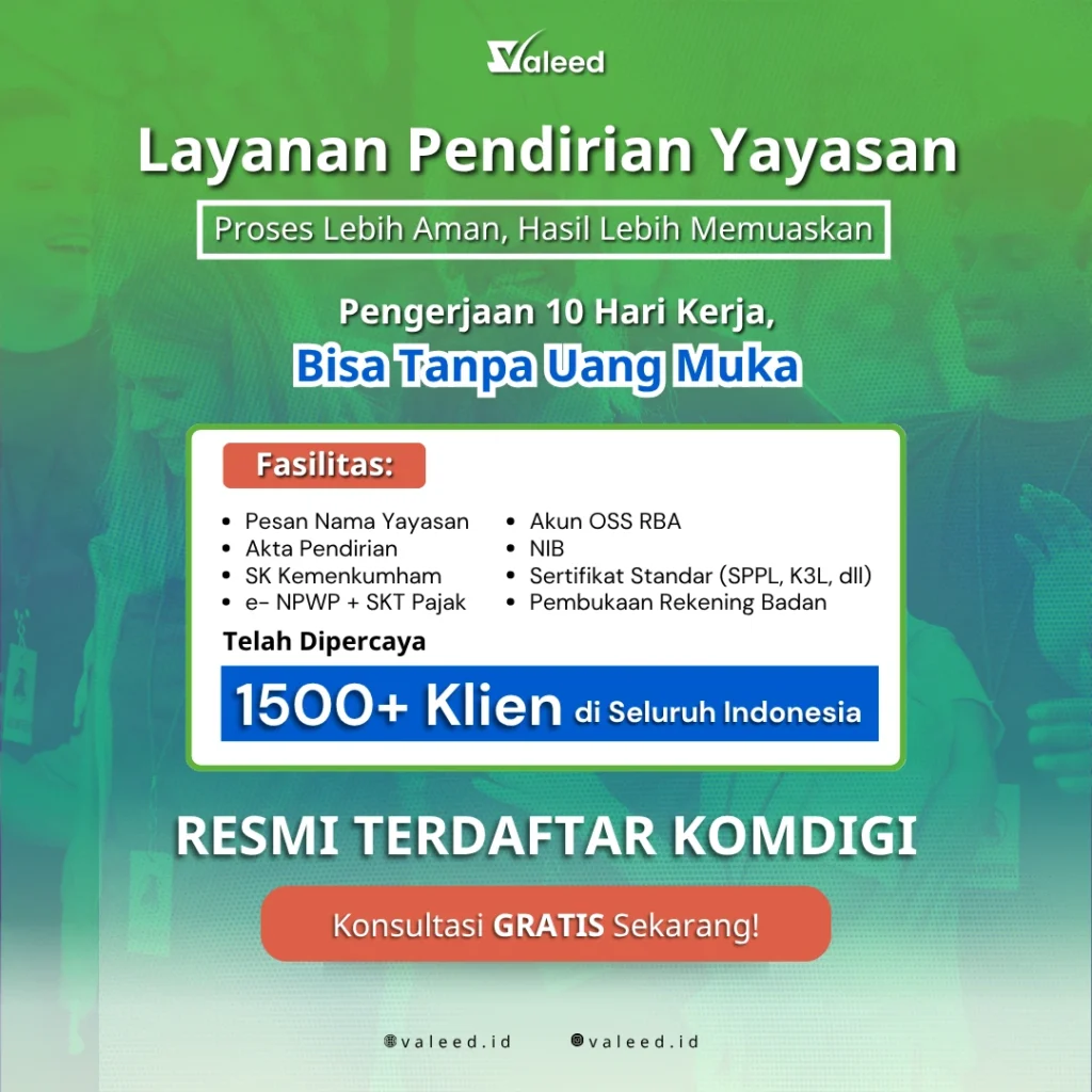 VALEED hadir sebagai solusi pendirian yayasan yang praktis, aman, dan sesuai regulasi terbaru. Seluruh proses, mulai dari penyusunan akta pendirian hingga pengesahan badan hukum oleh Kemenkumham, ditangani oleh tim profesional yang berpengalaman di bidang legalitas yayasan.